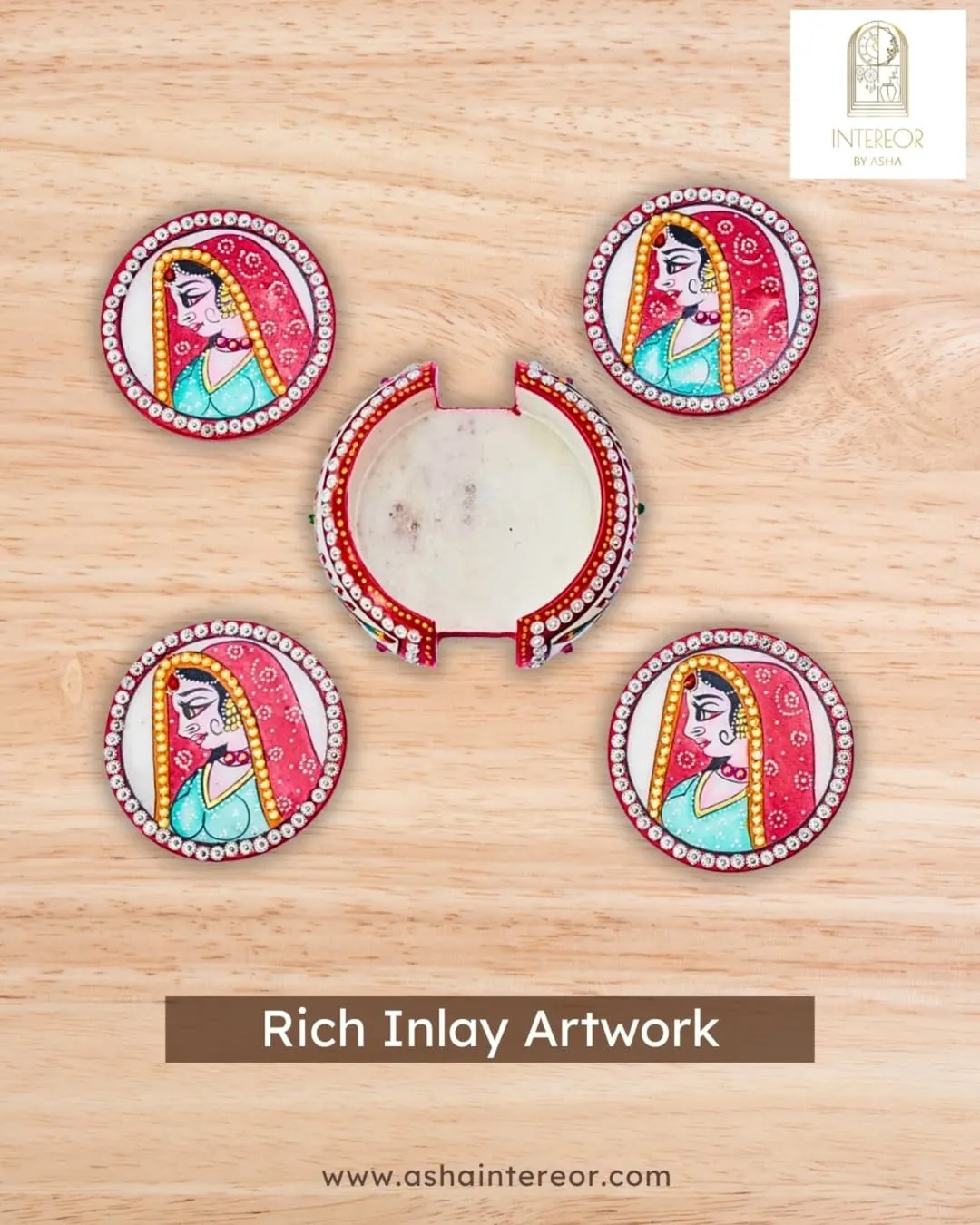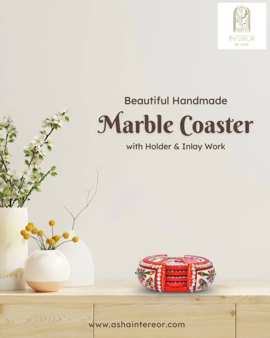 Beautiful Hand Made Marble Coasters With Holder & Inlay Work Set of 6 for Kitchen, Bar, Coffee-Table, Living Room/ Housewarming